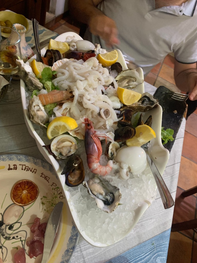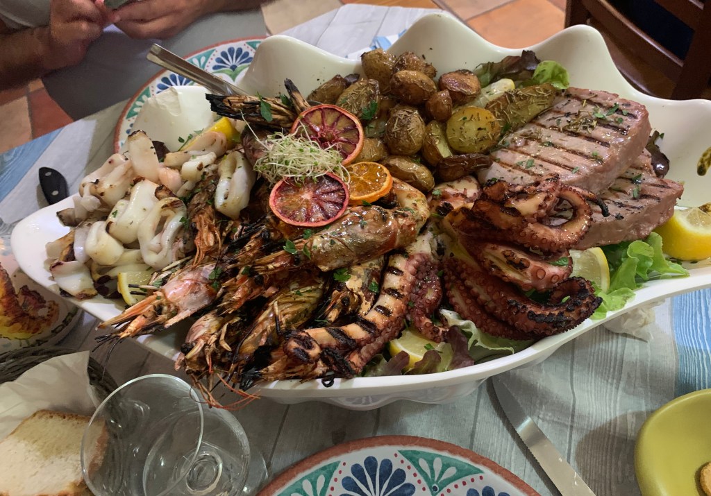 The main consisted of a mix grill – again huge. In fact the server had given us a clue of its size when he warned us that this is by weight and that it averages 30 – 35 euro a head as a cost, yet our enthusiasm pushed us to go forward with it, adding also some roast potatoes as contorni or side dish. The plate consisted of two large tuna steaks, twelve king prawns, a whole octopus as well as calamari, all grilled on a griddle giving a nice char. While happily enjoying our meal, the owner’s son came to us and told us that the grilled calamari was now getting cold and whether we would like to have it slightly grilled again. We said yes and after five minutes or so, he came back with an enhanced version of our calamari – this time in oil, lots of garlic and tomatoes.