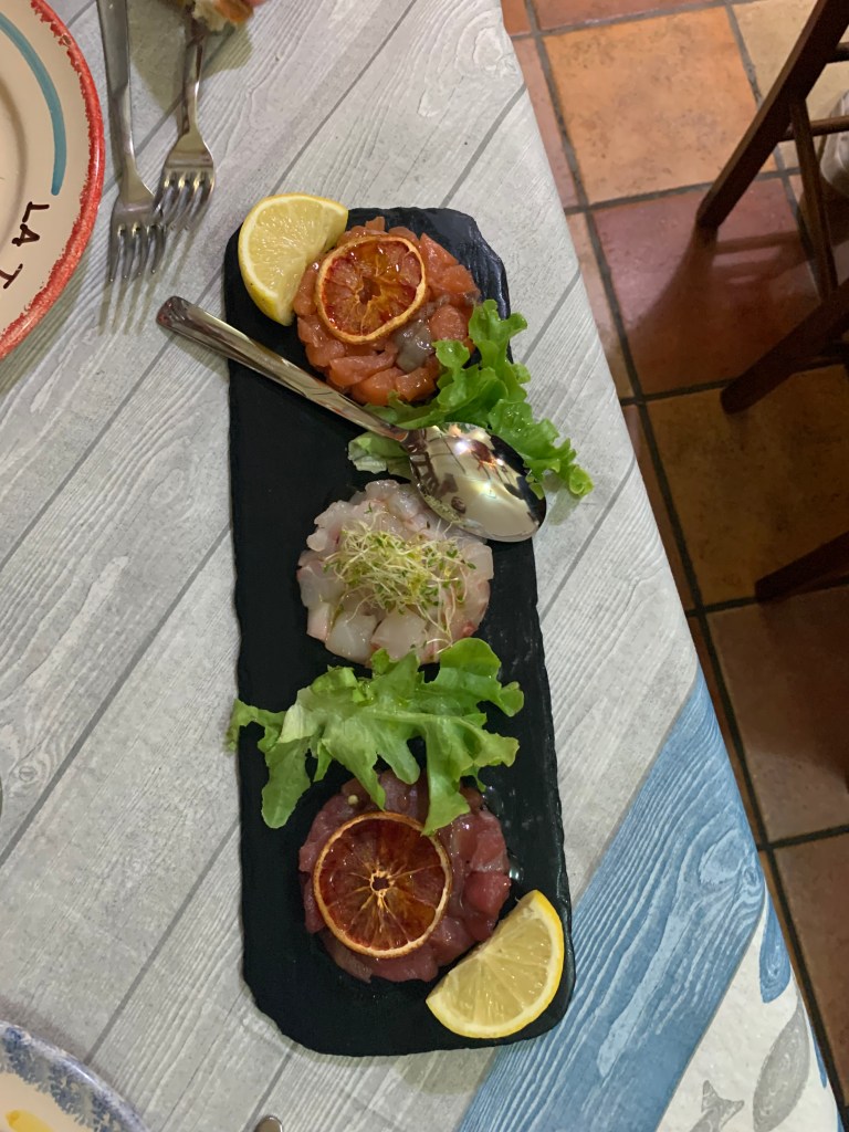 As a starter we opted for the plate of crudi, given that we had some previous excellent experiences with crudi in other parts of Italy. He suggested that we add the tartare of salmon, tuna and a white fish, and we gladly obliged. We paired this with a nice verdeca wine – Alice from Manduria – a rather rare variety of grape from Puglia, which proved to be a perfect accompaniment to the food. A fruity light wine, slightly minerally and rather citrusy.